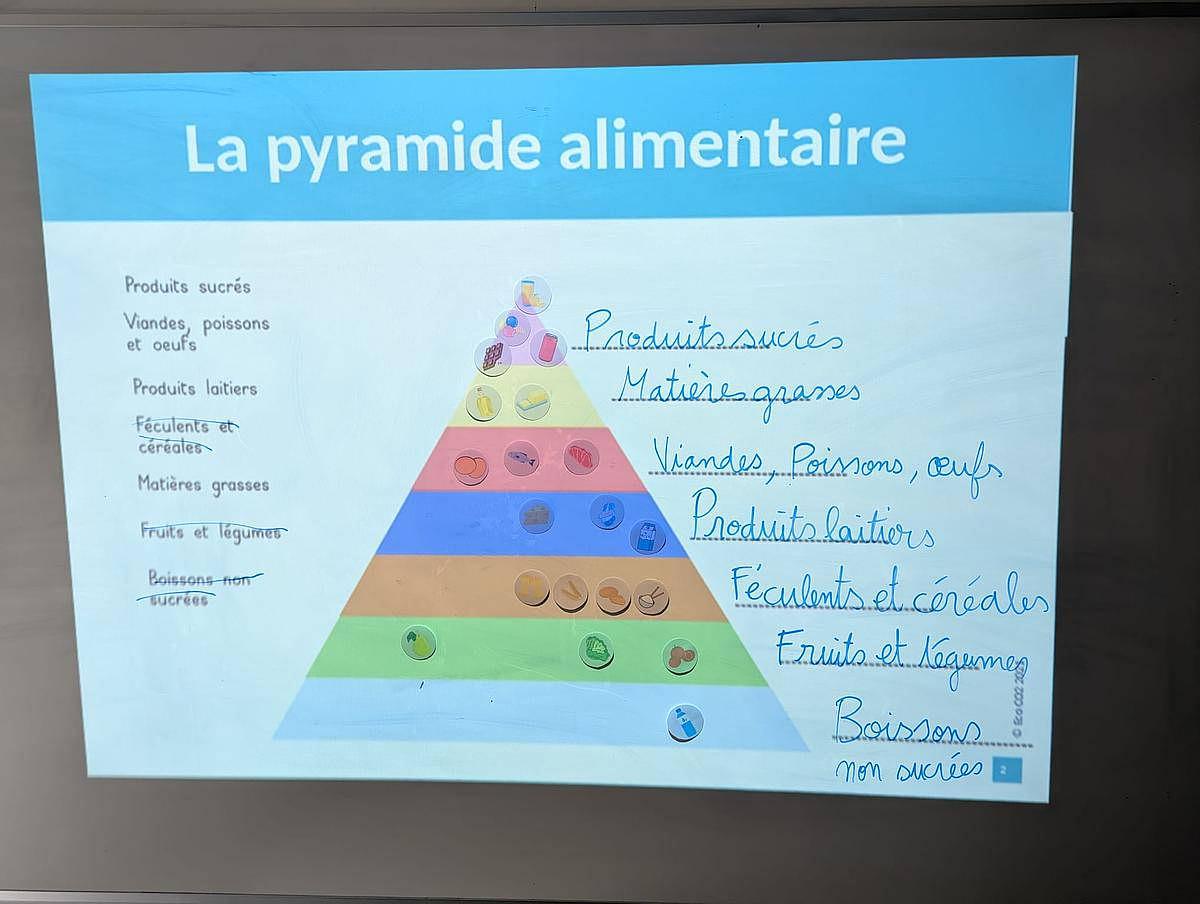 L'atelier débute autour de la pyramide alimentaire afin que les élèves puissent prendre conscience de l'ordre d'importance des différentes familles d'aliments dans une optique d'alimentation saine pour être en bonne santé.