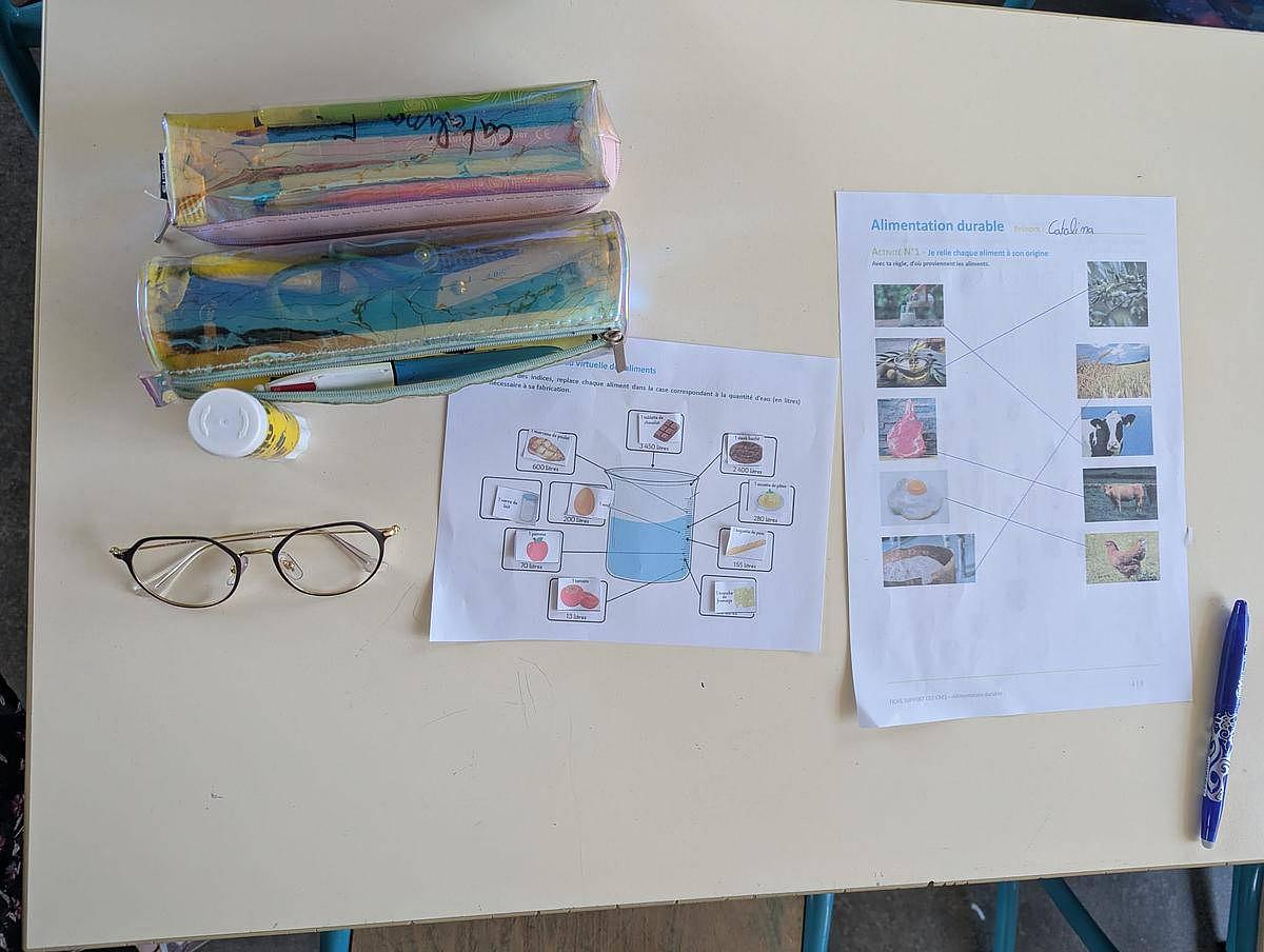 Les élèves découvrent que pour produire des légumes moins d'eau est nécessaire que pour produire de la viande ; plus d'eau est nécessaire pour produire de la viande de bœuf en comparaison à de la viande de poulet.
