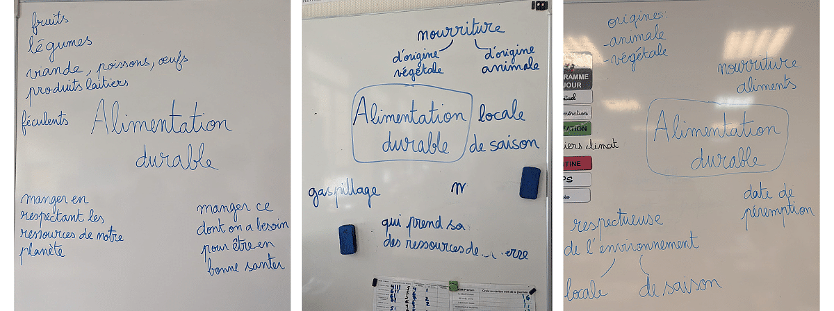 L'atelier débute par une réflexion collective sur ce qu'est l'alimentation durable : une alimentation qui nous apporte ce dont on a besoin pour être en bonne santé tout en respectant et préservant les ressources de notre planète - y compris pour les générations futures. Cela passe, par exemple, par manger local et de saison.