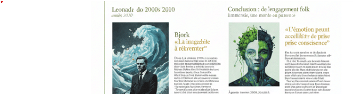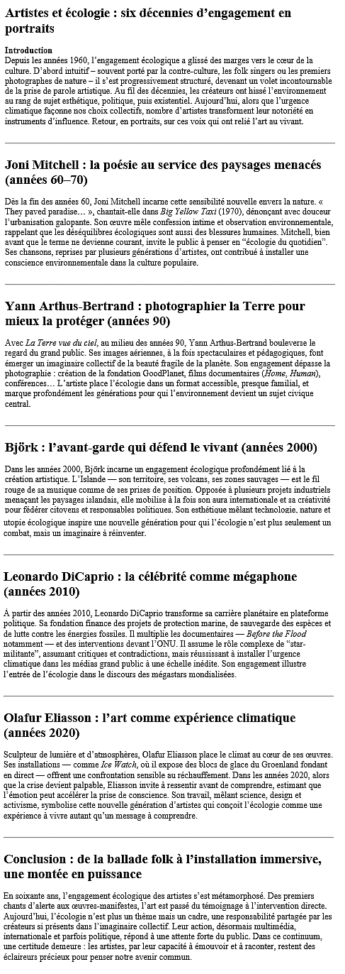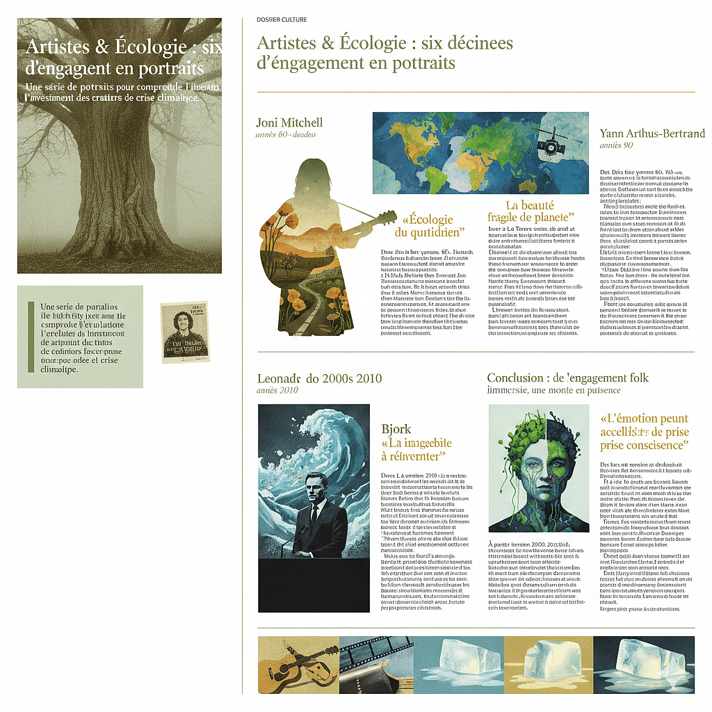 Objectif : Créer la mise en page d’un article culturel destiné à un public de 60 ans et plus, style Télérama. L’article comprend une introduction, une conclusion et une série de portraits d’artistes engagés pour l’écologie (Joni Mitchell, Yann Arthus-Bertrand, Björk, Leonardo DiCaprio, Olafur Eliasson). L’esthétique doit être élégante, lisible, chaleureuse et accessible. 1. Format général Créer une mise en page magazine élégante et moderne. Style inspiré de Télérama, avec titres sobres, grande lisibilité, espaces blancs, colonnes larges. Prévoir un format A4 vertical, version imprimable et version écran. Police recommandée : titres en serif (type “Merriweather” ou “Télérama-style”), corps en sans-serif lisible (type “Inter”, “Source Sans”, ou similaire). Couleurs douces : palette ocre, vert sauge, gris doux, beige, pour rappeler le thème écologique. 2. Structure du document Page de garde : Titre principal : Artistes & Écologie : 60 ans d’engagement en images Sous-titre : Une série de portraits pour comprendre l’évolution de l’investissement des créateurs face à la crise climatique. Image pleine page liée à l’écologie (paysage naturel, forêt, texture de terre, etc.). Style sobre, identité visuelle cohérente avec le magazine. Page d’introduction Encadré avec texte d’introduction fourni. Petite photo d’ambiance (ex. vieille affiche militante, photo de nature des années 70, etc.). Pages Portraits (une page par artiste) Pour chaque portrait, créer une mise en page répétable : Titre : Nom de l’artiste + décennie principale d’engagement. Sous-titre bref (ex. “La poésie au service du paysage menacé”). Photographie libre de droits OU image générée représentant l’artiste sans imiter une photo réelle protégée : Utiliser une approche stylistique (illustration artistique, silhouette réaliste mais non identique, portrait évocateur sans reproduction exacte). Ajouter un fond visuel évoquant l’écologie : textures naturelles, couleurs douces, lumière naturelle. Texte du portrait (prévoir un bloc d’environ 1000 caractères). Une mise en avant graphique d’une citation clé ou d’un mot-clé (“écologie”, “engagement”, “climat”). Artistes à intégrer : Joni Mitchell Yann Arthus-Bertrand Björk Leonardo DiCaprio Olafur Eliasson Page de conclusion Texte de conclusion fourni. Image d’ensemble : par exemple un collage de paysages, installations artistiques, scènes de concerts engagés, etc. Dernière page (facultative) Bibliographie visuelle, ou page “Pour aller plus loin”. 3. Illustrations & images Utiliser des images libres de droits OU des illustrations générées inspirées des artistes sans reproduire leurs visages exacts pour éviter les droits à l’image. Style recommandé : Illustrations semi-réalistes, textures naturelles, lumière douce. Couleurs harmonisées avec l’ensemble du magazine. 4. Contraintes de lisibilité pour un public 60+ Taille de police confortable : Titres : 28–34 pt Sous-titres : 18–22 pt Corps : 14–16 pt Fort contraste texte/fond. Interlignage généreux. Hiérarchie visuelle claire (titres bien marqués, encadrés pour citations). 5. Style global de l’article Ton culturel, élégant, sobre. Équilibre entre modernité et esthétique “magazine senior”. Priorité à la clarté et à l’harmonie visuelle. 6. Contenus textuels à intégrer : "Copier/Coller Le texte généré plus tôt
