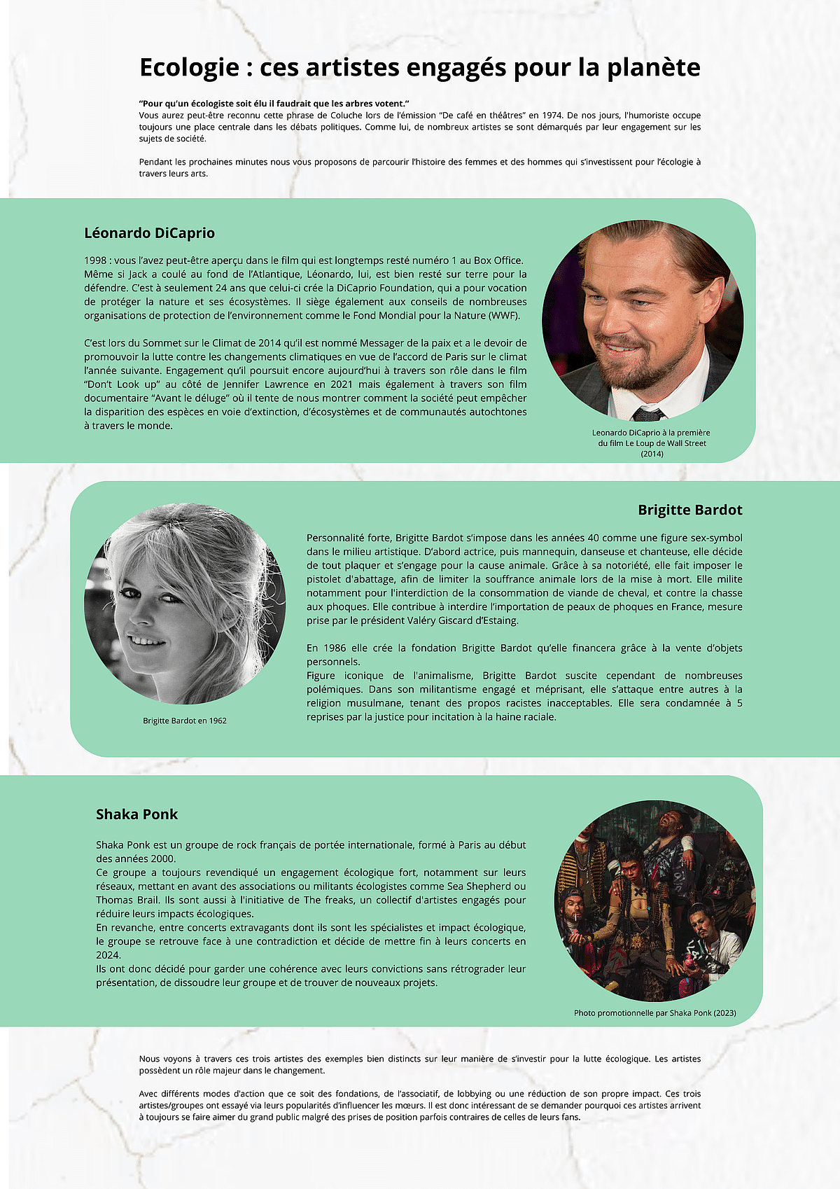 Nous avions l’ambition de présenter un panel large de célébrités qui ont œuvré ou œuvrent encore aujourd’hui pour la protection de l’environnement (Sting, Bardot, Shaka Ponk,etc…) à travers leurs arts ou leurs actions.