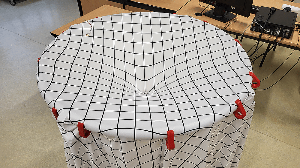 Un mobile (une pièce de monnaie lancée sur sa tranche) est mis en rotation autour d’une dépression au centre du tissu. Le mouvement de la pièce engendre des vibrations dans le tissu, qui déforment le milieu de la même manière que les ondes gravitationnelles déforment l’espace-temps. Un capteur piézoélectrique est fixé sur la toile, qui permet de mesurer en direct les contraintes mécaniques recueilles par le capteur et de transmettre le signal électrique associé vers un ordinateur. Le signal est visualisé et est alors représenté de sorte à en exhiber les fréquences présentes au cours du temps.