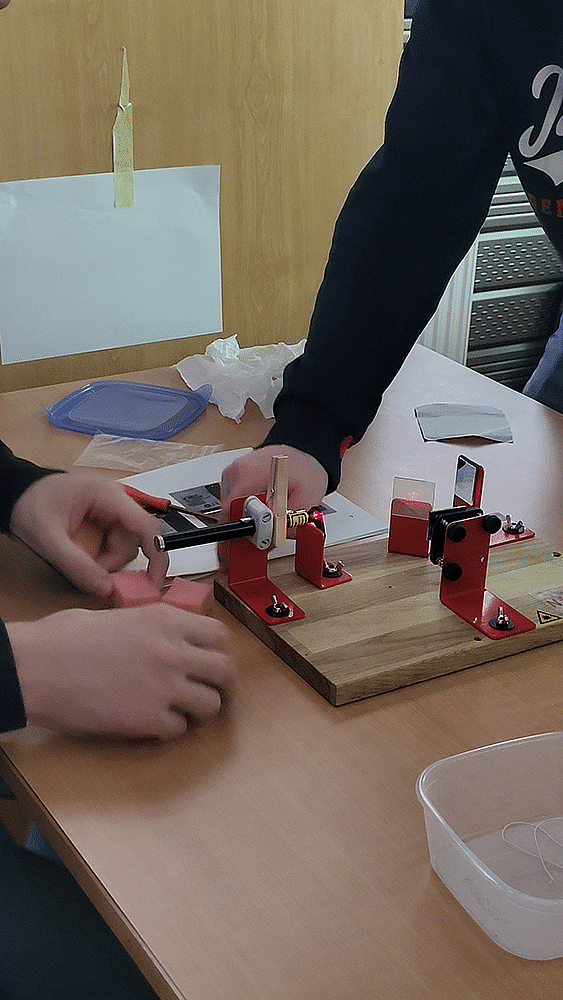 Une conférence a été donnée en préambule sur l’astronomie gravitationnelle à travers ses aspects historique et scientifique, donnant quelques clefs de compréhension aux élèves pour le troisième atelier : un atelier de construction d’interféromètre de Michelson ! Sous l’œil attentif du scientifique, ils se sont initiés aux manipulations et aux réglages minutieux que nécessitent les appareils optiques de précision.