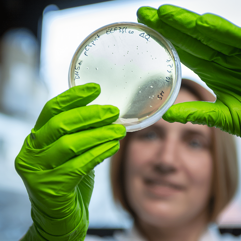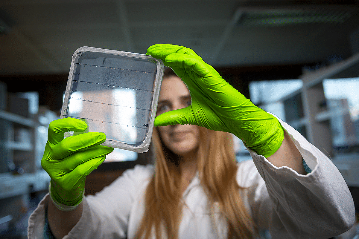 Pour les besoins du projet, des bactéries sont modifiées génétiquement, de manière à leur faire produire en grande quantité cette protéine d’intérêt afin, dans un second temps, de l’isoler et de l’analyser. Les bactéries modifiées sont ici observées à l’œil nu pour vérifier leur développement.