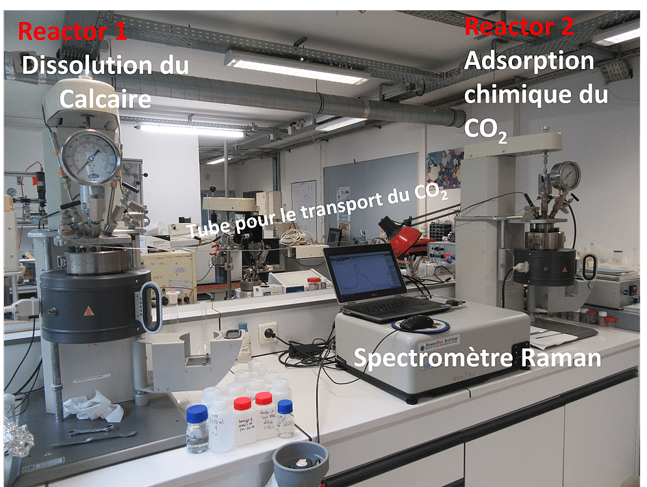 Figure 1. Dispositif expérimental à ISTerre : Couplage de la dissolution de calcaire en milieu acide avec un piégeage simultanée du CO2 par adsorption chimique dans une solution de soude. L’adsorption chimique du CO2 suivie en temps réel par spectroscopie Raman.