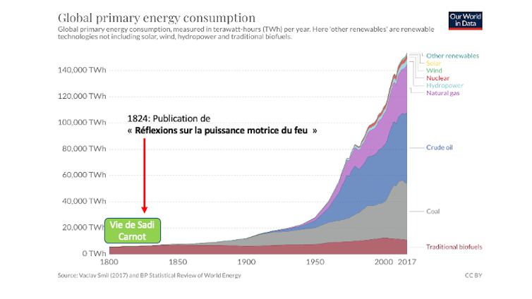 En son temps, Sadi Carnot a décrit clairement le potentiel de progrès pour l’humanité dans la maîtrise de la chaleur pour produire du mouvement. Deux siècles plus tard, la partie s’est jouée comme il l’a anticipé. Mais nous savons aujourd’hui qu’elle ne peut pas continuer ainsi. La brutalité des effets du réchauffement climatique dû au dioxyde de carbone relâché dans l’atmosphère est là comme un sous-produit inévitable de cet immense feu planétaire. Le programme de Sadi Carnot établi il y a 200 ans n’est plus un avenir possible pour l’humanité.