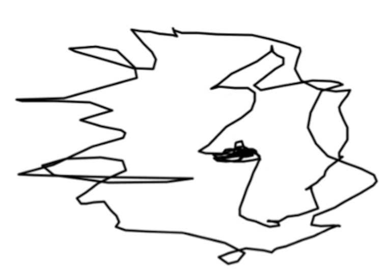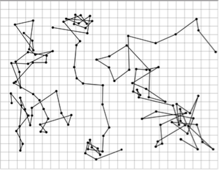 Reproduction d'un dessin de Jean Perrin dans Mouvement brownien et réalité moléculaire. Sont représentées ici trois trajectoires apparentes de particules de mastic d'environ 1 µm de diamètre. Les positions successives des particules, pointées toutes les 30 secondes, sont reliées par des segments.