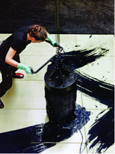 Elle ajoute le changement de direction sur place par une rotation en un point : en clair, elle tourne autour de sa brosse grâce au guidon. Elle avance tout en brisant la trace laissée derrière elle par cette énorme brosse sur ces grands formats posés au sol. C’est là un effet induit par son dialogue avec la gravité terrestre : pour manipuler cette brosse devenue très lourde, elle la soutient par un câble et lui attache un guidon de vélo. Elle peut alors changer de direction en la faisant tourner sur elle-même en un point autour de la verticale.