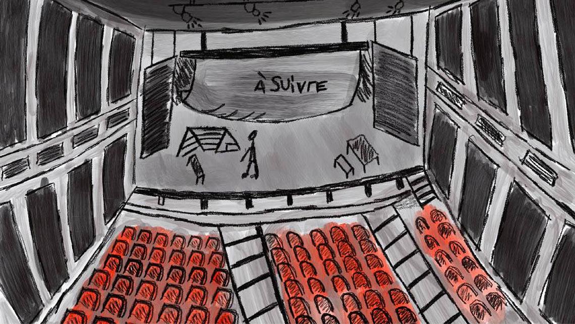 Pasaloma passe dans un couloir et elle entend un bruit au loin. Elle s’approche, colle son oreille à la porte, hésite un peu puis entre très discrètement. Elle se trouve alors dans une salle de spectacle. Sur scène, une pièce de théâtre est en train d’être jouée. Elle s’assoit sur un fauteuil à côté d’une vieille dame.