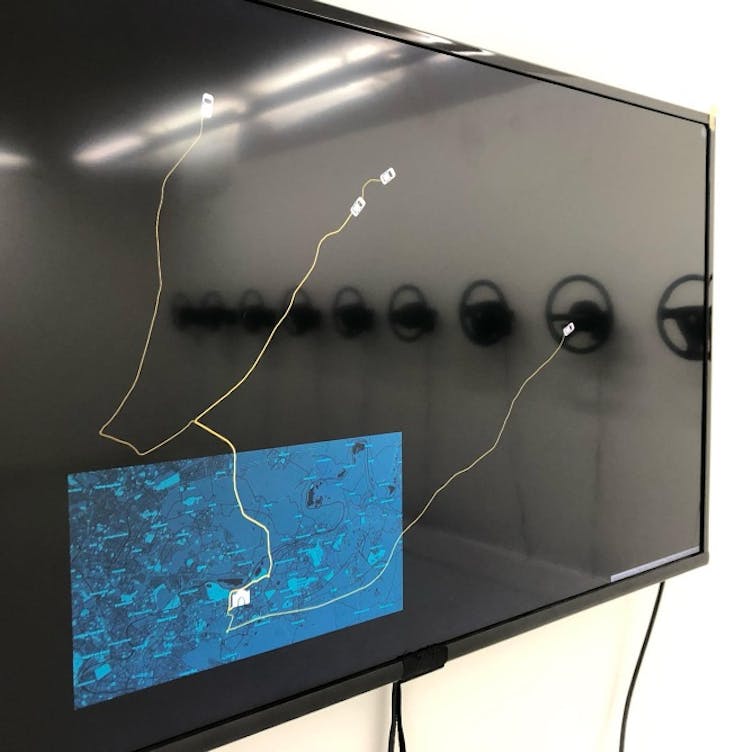 Ils tournent à droite, puis à gauche, puis reviennent dans leur position « aller tout droit », pour tourner à nouveau à droite ou à gauche. Apparemment, ils passent leur temps à « conduire » chacun une voiture virtuelle dans une sorte de Google Maps. L’écran sur le mur latéral montre les neuf petites voitures en mouvement, allant chacune vers sa destination choisie par un visiteur.