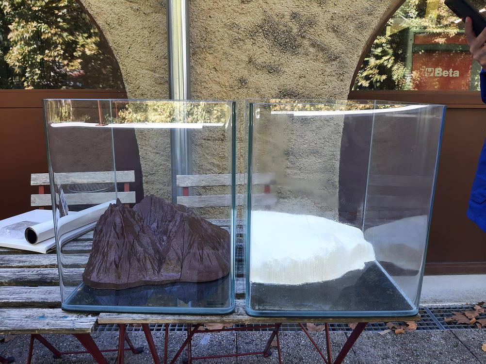 Pour assurer l’étanchéité de l’expérience, nous avons acheté les aquariums directement en animalerie puis nous avons conçu les reliefs à imprimer en 3D. Le logiciel Touch Terrain nous a permis d’extraire de vrais reliefs géographiques. Nous avons choisi l’aiguille du Cédéra dans le sud des Ecrins pour rester local, et un bout de la péninsule Antarctique pour la cuve illustrant la banquise.