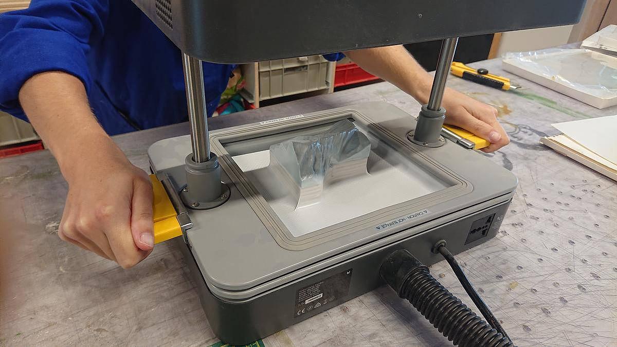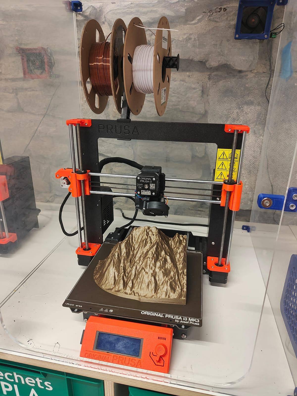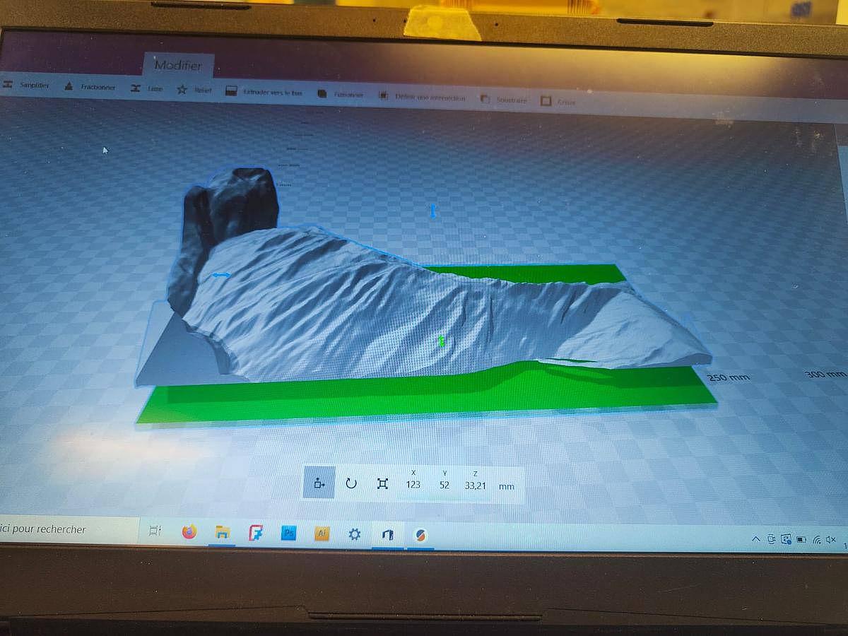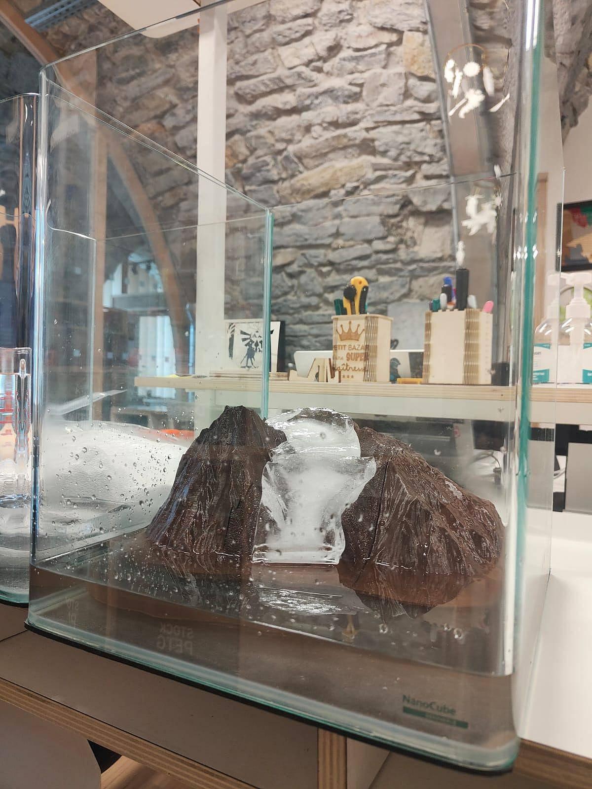 Sur les conseils des membres du Fab Lab, nous avons utilisé du plastique PETG, plus étanche. Pour les moules à glaçons, nous avons imprimé la zone d’écoulement glaciaire en négatif. Ensuite, en thermoformant des feuilles de plastique sur ces pièces, nous obtenions un moule à glaçon adapté à la montagne. Pour les ajustements finaux sur la maquette, on a aussi utilisé du joint silicone blanc, de la peinture acrylique et du vernis.