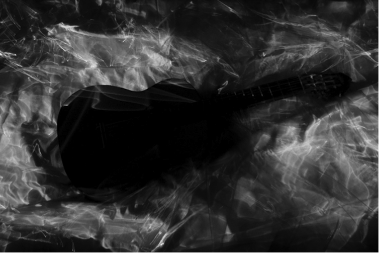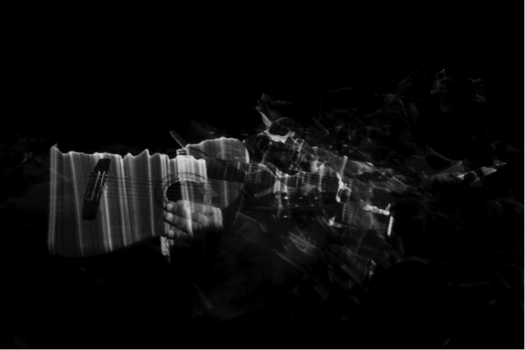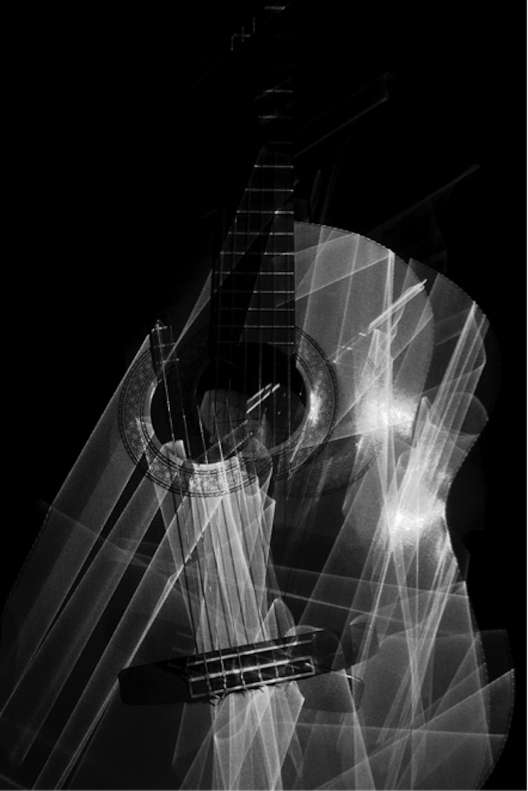 Pendant l’acquisition de la lumière, Cédric Poulain bouge tout, la source lumineuse comme la scène explorée par ce toucher lumineux. On le voit sur l’image de la guitare ci dessous qui nous apparaît sous plusieurs angles simultanément. Si ma vision avait les caractéristiques du dispositif utilisé, c’est ainsi que je verrais ce monde mouvant… pour de vrai.