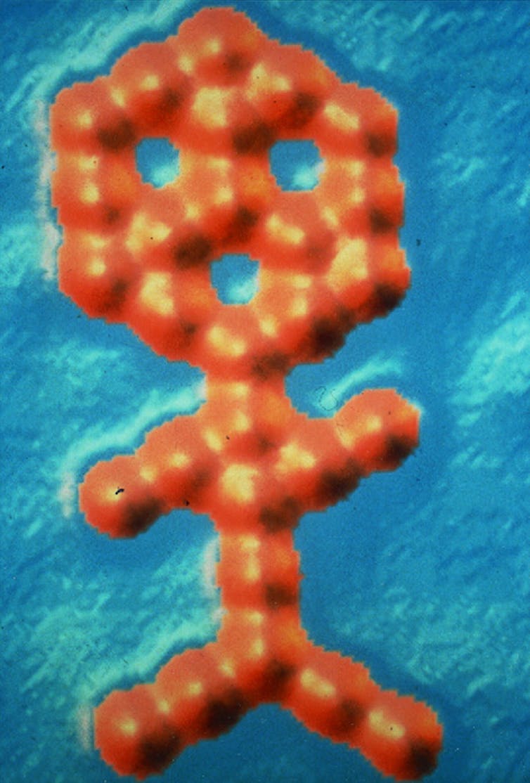 Que dit ici, ce CO-man constitué de quelques molécules de monoxyde de carbone, fabriqué et enregistré au cœur d’un microscope à effet tunnel, par la pointe d’une tige en métal balayée très lentement sur toute la surface ?