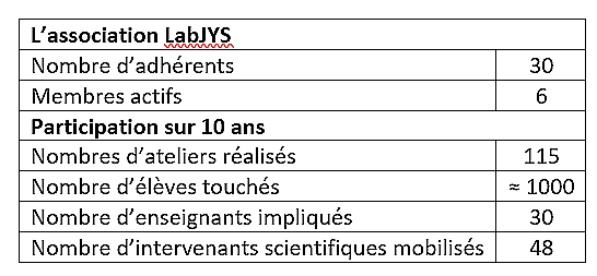 En lien étroit avec le Centre pilote La main à la pâte de Grenoble implanté au collège Lucie Aubrac, et avec les équipes pédagogiques du collège et de la circonscription de Grenoble 2, le LabJYS propose chaque année un programme d’ateliers scientifiques destinés aux élèves de CM1, CM2 et 6e. L’association s’appuie sur l’engagement de chercheurs, d’ingénieurs et de professionnels de la médiation scientifique du territoire grenoblois ainsi que sur l’encadrement des groupes d’élèves par les professeurs des écoles et du collège. Ce dispositif gagnant-gagnant participe également au développement professionnel des enseignants.