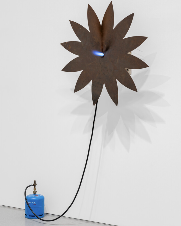 Jannis Kounelis, lui, fait brûler du gaz à travers une buse dans une fleur en acier brut. Le gaz forme une petite torchère bleue, produisant un bruit caractéristique. La bonbonne de gaz est bien visible. C’est un feu très propre, très contrôlé, celui qui va permettre d’atteindre des hautes températures, et donc de produire le mouvement et les transformations de la matière.