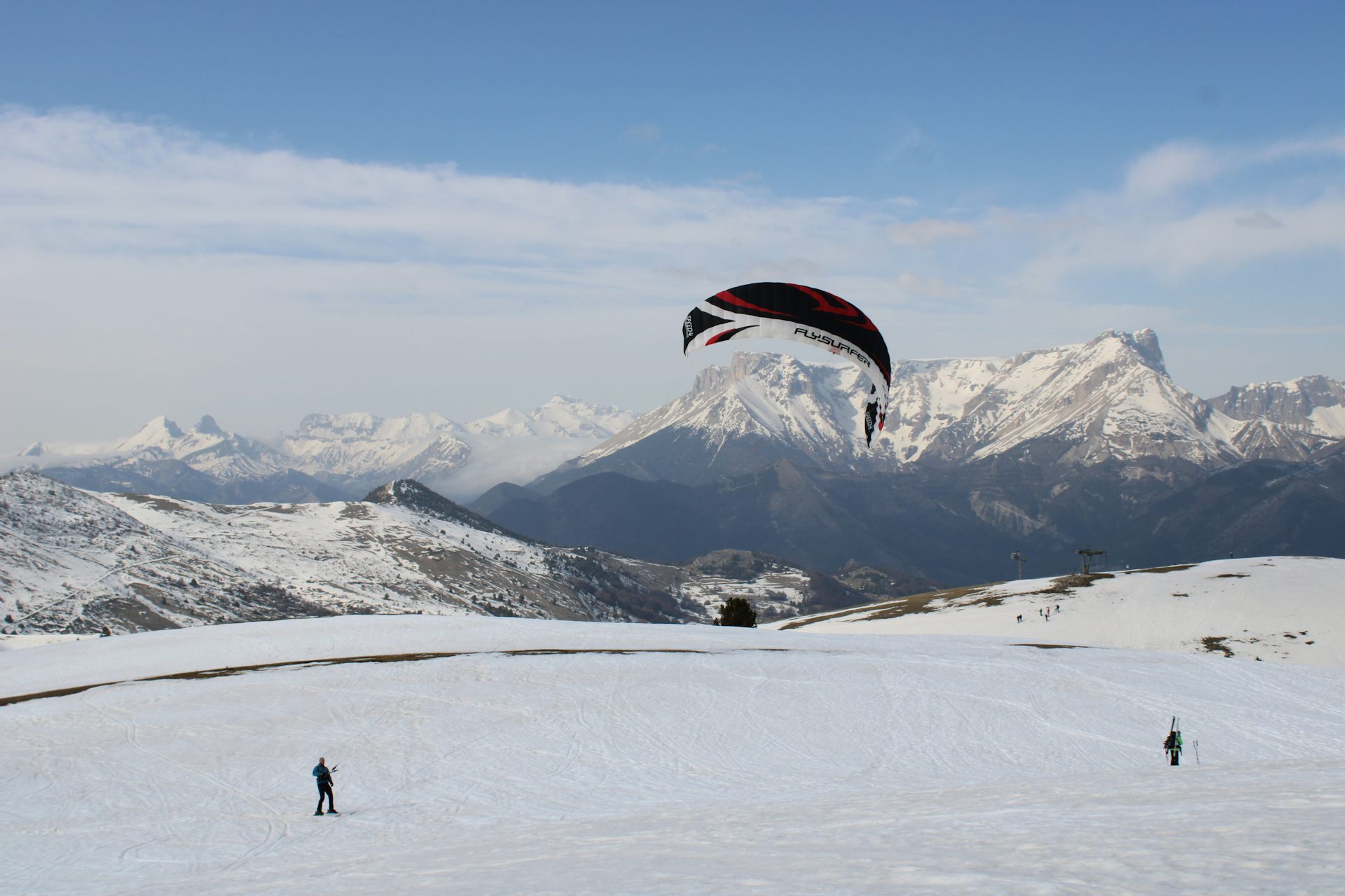 Un adepte de snowkite, avec la Céüse au premier plan et le Dévoluy en second plan. Author provided