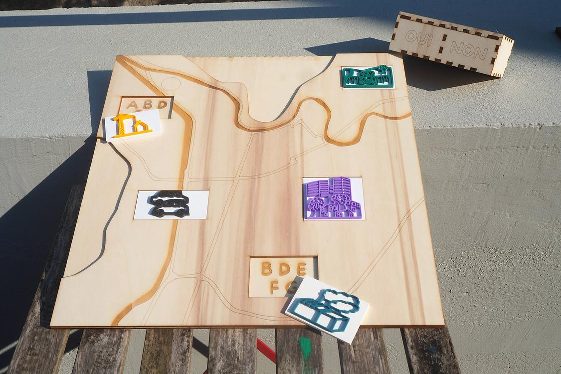 La maquette fut un beau succès, les enfants appréciant de repérer l’endroit où iels habitaient, leur école… Iels furent très impliqué·es dans le jeu, et donnèrent de nombreuses recommandations supplémentaires pour les cartes « OUI » - comme par exemple l’idée de se déplacer à poney, d’utiliser plus son corps et moins les machines, ou encore d’arrêter certaines usines.