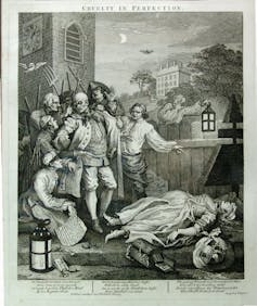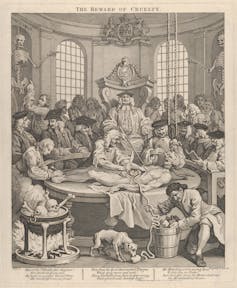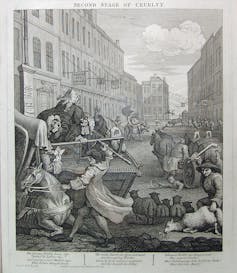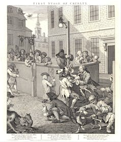 La dureté des mœurs de son temps envers les animaux a inspiré à l’artiste William Hogarth sa fameuse fable picturale intitulée « les quatre étapes de la cruauté », réalisée en 1751. Dans cette série de gravures, l’artiste a représenté l’escalade cruelle d’un jeune Londonien, Tom Nero, de son enfance jusqu’à sa pendaison après avoir commis un homicide.
