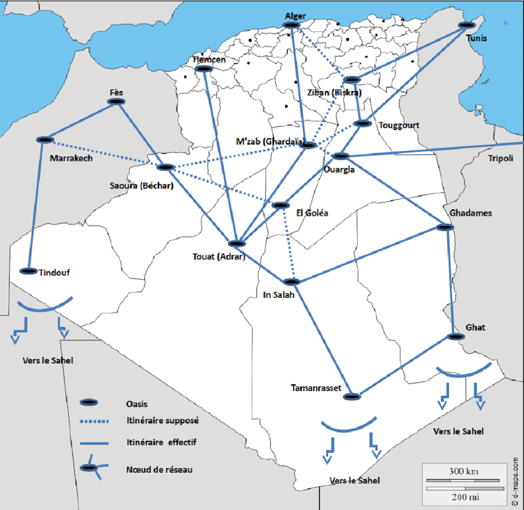 Les villes-carrefours transsahariennes. Pliez O., _Vieux réseaux et nouvelles circulations entre les deux rives du Sahara_ (2002), carte modifiée par l’auteur