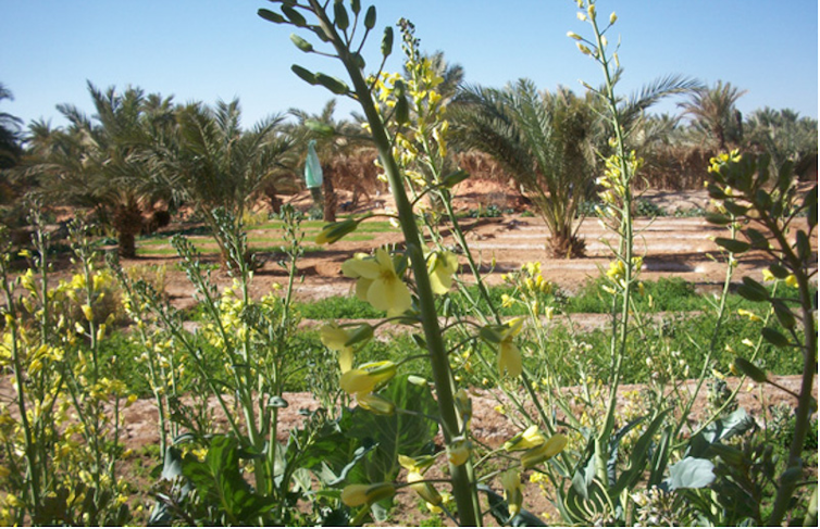 Jardin oasien biodiversifié sur 2 étages dans la palmeraie du Ksar de Ouargla en Algérie. En avant-plan, il s’agit de choux fourragers avec deux variétés, à fleurs jaunes et blanches. L’agriculteur produit sa propre semence. Juste derrière, il s’agit de luzerne dont la variété permet 10 coupes par an. Khaled Amrani, Author provided