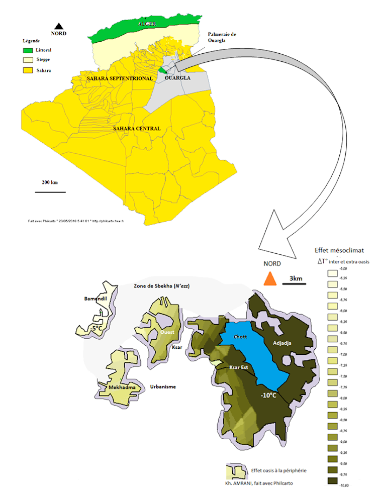 Simulation de l’effet méso climatique dans la palmeraie de la cuvette de Ouargla. L’effet méso climatique est très peu documenté et fait l’objet de nombreuses critiques. Certains auteurs le classe comme étant un microclimat. Or, les écologues dont l’ornithologue Jacques Blondel précise que ce dernier règne dans un vieux tronc d’arbre, par exemple, qui abrite une entomofaune xylophage (qui mange le bois) diversifiée et qui contribue à l’équilibre écologique de la forêt. Blondel J, _Biodiversité et naturalité : histoire et évolution des concepts_ (2012), CC BY-NC-ND