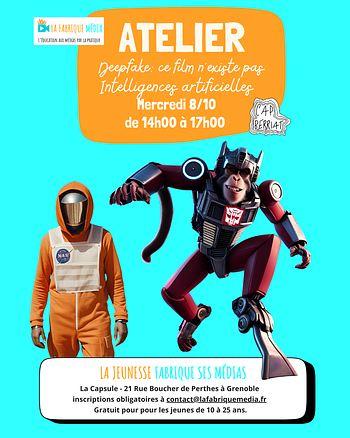 Après avoir été sensibilisés au fonctionnement et aux usages des intelligences artificielles, les participant·es seront amenés à réaliser une production numérique. En s’inspirant de fiches de présentation de film (type Allociné), les participant·es vont créer la promotion d’un film qui n’existe pas : titre, synopsis, affiche, photo de tournage, avis de la presse, interviews d’acteurs et actrices et même trailer… en utilisant les IA génératives. Les participant·es exploreront ainsi les capacités de ces nouveaux outils et leurs limites. Ils et elles seront amené·es, par la pratique, à aiguiser leur esprit critique, questionner la notion d’auteur et la relation au réel.