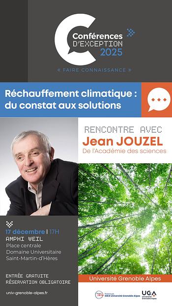 Dans le cadre du cycle « Conférences d’exception : faire connaissance », l’Université Grenoble Alpes accueille Jean Jouzel, célèbre climatologue français connu pour ces travaux en paléoclimatologie et au sein du GIEC (Groupe d'experts Intergouvernemental sur l'Évolution du Climat).