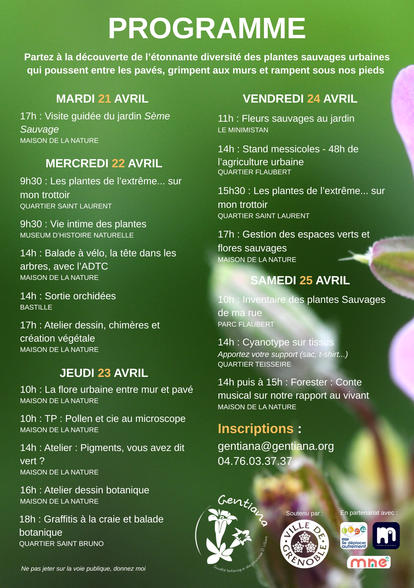 Le Festival des Sauvages #5, organisé par l’association Gentiana se déroulera du 21 au 25 avril. Il sera l’occasion de faire connaissance avec ces espèces sauvages inconnues que les habitants croisent pourtant quotidien. Les habitants pourront découvrir les plantes sauvages urbaines, qui poussent sur les trottoirs, les vieux murs et entre les pavés des rues et parcs de Grenoble.