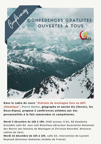 Mardi 16 décembre de 16h à 18h, UIAD annexe au 6 bis, Bd Gambetta à Grenoble, salle G4 : intervention de Laurent Reynaud (directeur domaines skiables de France).